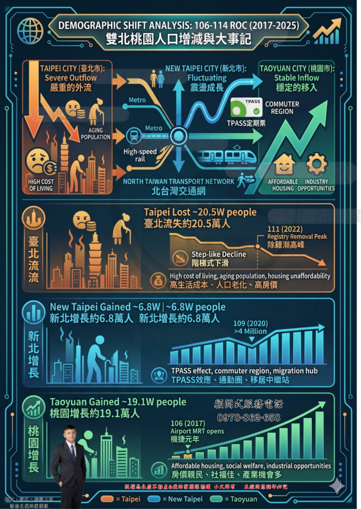 Home 所有文章 【深度專題】北台灣人口大洗牌:106-114 年雙北桃園人口移轉全紀錄與地產戰略解析