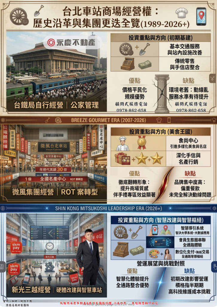 | 2.0 覺醒期 | 微風集團 | 美食與伴手禮 | 徹底翻轉形象,將北車變為美食天堂。 | 品類單一(餐飲為主),未解決迷宮動線。 |